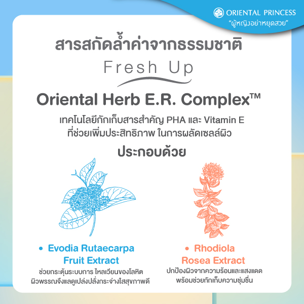 Oriental Herb E.R. Complex™ เทคโนโลยีกักเก็บสารสำคัญ PHA และ Vitamin E ที่ช่วยเพิ่มประสิทธิภาพในการผลัดเซลล์ผิว ด้วยอนุภาคขนาดเล็กระดับ SUB – MICRON จึงซึมซาบผิวได้ล้ำลึก เพื่อช่วยฟื้นฟูสภาพผิว พร้อมเสริมความชุ่มชื่นให้ผิวนุ่มเนียน กระจ่างใสแลดูสุขภาพดี ประกอบด้วย