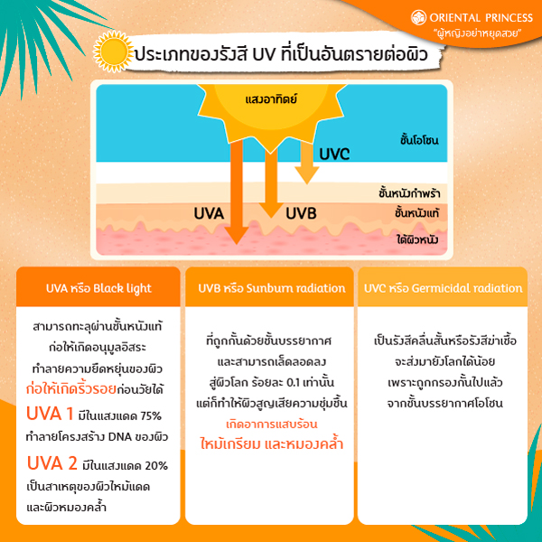 - UVA 2 เป็นรังสี UV ที่มีอยู่ในแสงแดด 20% ที่เป็นสาเหตุของผิวไหม้แดด และผิวหมองคล้ำได้