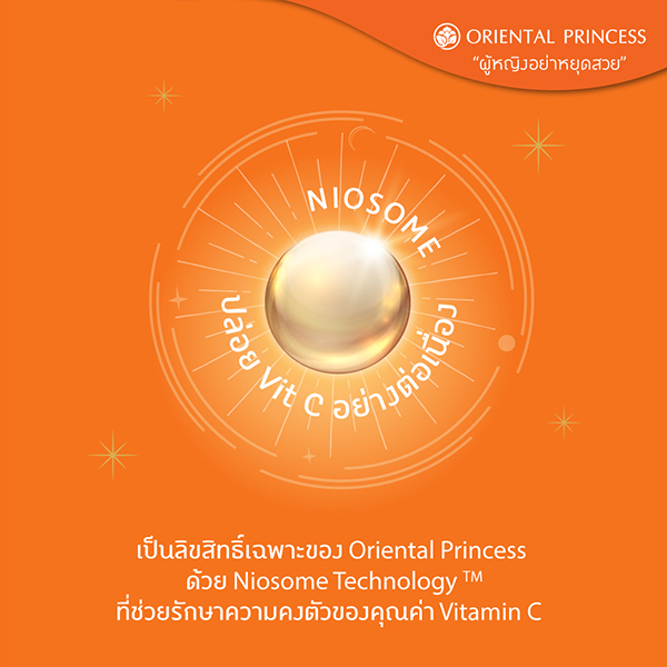 2. ผลิตจากนวัตกรรม Niosome Technology™ ที่ทำหน้าที่กักเก็บประจุวิตามิน ซี พร้อมนำพาคุณค่าวิตามิน ซี ที่มีความคงตัวสูง และสามารถออกฤทธิ์ได้ยาวนาน อีกทั้งยังซึมลึกเข้าสู่ผิวได้ดี โดยจะค่อยๆ ปล่อยประจุวิตามินซีลงสู่ชั้นผิวอย่างต่อเนื่อง