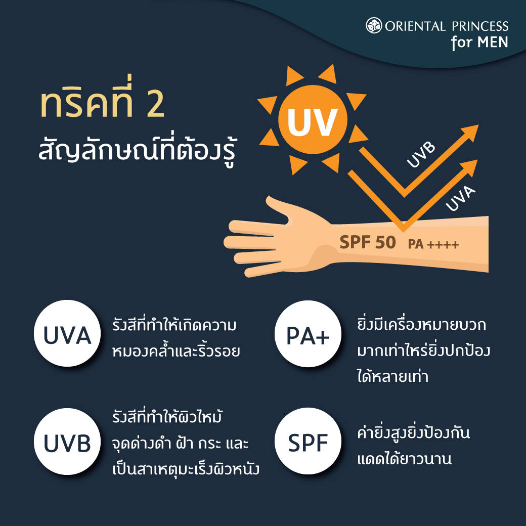 ทำความเข้าใจเกี่ยวกับสารกันแดด เช่น UVA คือรังสีที่ทำให้เกิดความหมองคล้ำและริ้วรอยแห่งวัย รังสีชนิดนี้ยังสามารถทะลุผ่านชั้นกระจกได้ ยิ่งไปกว่านั้น ไม่ได้มีแค่แสงแดดที่ทำร้ายผิวเราเท่านั้นนะครับ แต่รังสีจากหลอดไฟในบ้านในออฟฟิศ ก็ทำร้ายผิวได้เช่นกัน UVB คือรังสีที่มีผลกับผิวหนังชั้นกำพร้า ทำให้ผิวไหม้จุดด่างดำฝ้ากระ และเป็นสาเหตุทำให้เกิดมะเร็งผิวหนัง หรือจำง่ายๆ ว่าตัว B คือ Burn นั้นเอง SPF เป็นตัวเลขที่บอกค่าการปกป้องแสงแดดของครีมกันแดด ยิ่ง SPF เยอะเท่าไหร่ก็ยิ่งปกป้องได้ดีและยาวนาน PA+ ค่าการปกป้องที่มีความคล้ายกับ SPF ยิ่งมีเครื่องหมาย + (บวก) เยอะมากเท่าไร ก็ยิ่งปกป้องได้หลายเท่า