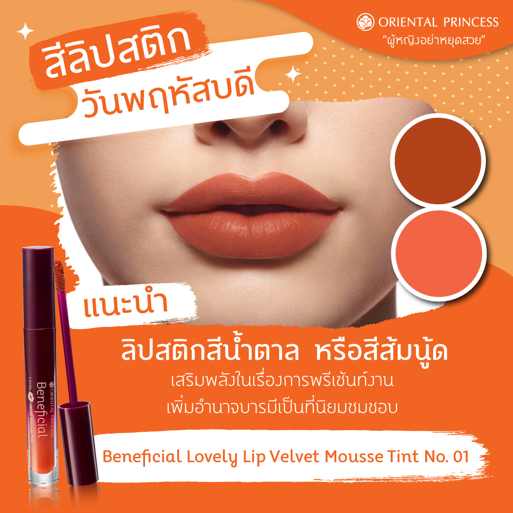 แนะนำ : ลิปสติกสีแดงสด หรือแดงมะเหมี่ยว ,สีชมพูอมส้ม