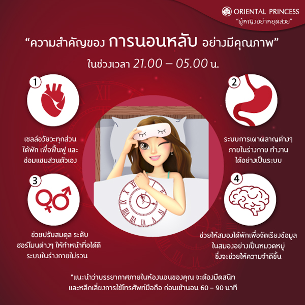 ซึ่งหมายถึงการนอนหลับอย่างมีคุณภาพ นั่นก็คือการนอนหลับลึกในช่วงเวลา 21.00 – 05.00 น.