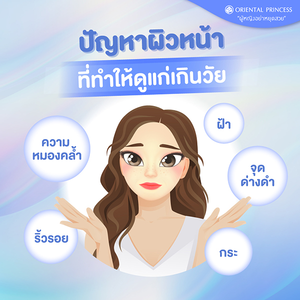 ความหมองคล้ำ ฝ้า กระ จุดด่างดำ และริ้วรอย คือ ปัญหาผิวหน้าที่ทำให้เราแลดูแก่เกินวัยซึ่งมาพร้อมกับวันเวลาที่เพิ่มขึ้นของอายุ และปัญหาเหล่านี้นับวันก็จะยิ่งทวีความรุนแรงยิ่งขึ้นไปเรื่อยๆ หากว่าเราดำเนินชีวิตท่ามกลางสภาพแวดล้อมปกติตามกิจวัตรประจำวัน โดยยังคงปล่อยปละละเลยให้ผิวต้องเผชิญหน้ากับปัจจัยที่เป็นตัวกระตุ้นให้ปัญหาทับถมทวีความรุนแรงขึ้นไปเรื่อยๆ มาดูกันค่ะว่ามีอะไรบ้างที่เป็นปัจจัยเสริมกระตุ้นให้ปัญหาเหล่านี้ชัดเจนยิ่งขึ้นไปอี๊กกก