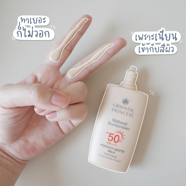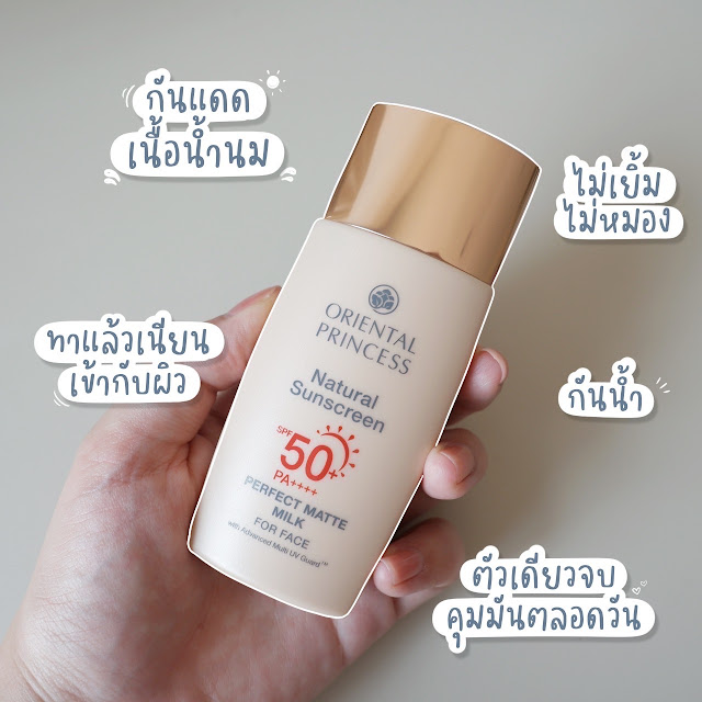 โปรดักส์ที่บอกคือ Oriental Princess Natural Sunscreen Perfect Matte Milk SPF 50+ PA+++ “กันแดดสีเนื้อผิวแมตต์” ตัวนี้เคลมเลยว่าเป็นกันแดดเนื้อนํ้านมพอทาไปซักพักเค้าจะเซ็ตตัวเป็นเนื้อแมตต์ เนื้อเค้าจะบางเบา เกลี่ยง่าย และช่วยปกปิดรอยดำรอยแดงได้ด้วย คือง่ายๆ ใช้แทนรองพื้นก็ได้ค่ะ ในกรณีที่ไม่ได้มีปัญหาผิวมาก หรือใช้เป็นเมกอัพเบสก็ได้ เพราะน้องช่วยปรับ ให้สีผิวเรียบเนียนสม่ำเสมอ ง่ายต่อการลงเมกอัพอื่นๆต่อ