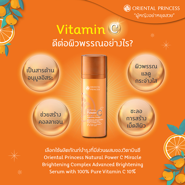 5. เลือกใช้ผลิตภัณฑ์บำรุงที่มีส่วนผสมของวิตามิน ซี จากธรรมชาติ อย่างต่อเนื่องเป็นประจำทุกวัน เพื่อลดเลือนความหมองคล้ำ ช่วยให้ผิวกระจ่างใสขึ้น ด้วยสุดยอดผลิตภัณฑ์ที่มีส่วนผสมหลักจาก Vitamin C ธรรมชาติ อย่าง Oriental Princess Natural Power C Miracle Brightening Complex Advanced Brightening Serum with 100% Pure Vitamin C 10% คุณค่าบำรุงเข้มข้นสูงสุดทุกสีผิวผิวกระจ่างใสขึ้นใน 7 วัน ปรับผิวให้แลดูเนียนเรียบ ด้วยคุณค่าสารสกัด Nano Encapsulation เทคโนโลยีนำพาอานุภาคขนาดเล็กของวิตามิน ซี ให้แทรกซึมลงสู่ในผิวพร้อมค่อยๆ ปล่อยประจุวิตามินอย่างต่อเนื่อง ช่วยฟื้นฟูผิวอย่างต่อเนื่อง ลดเลือนจุดด่างดำ และรอยหมองคล้ำได้อย่างเป็นธรรมชาติ