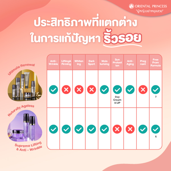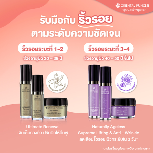 เพราะตระหนักถึงความรุนแรงของปัญหาริ้วรอยที่แตกต่างตามช่วงวัยของแต่ละคน ดังนั้น การดูแลแก้ไขปัญหาริ้วรอยได้อย่างมีประสิทธิภาพ และเห็นเห็นผลได้อย่างชัดเจน นั่นก็คือ การแก้ไขปัญหาอย่างตรงจุดที่สุด Oriental  Princess เข้าใจอย่างลึกซึ้งถึงระดับความชัดเจนของริ้วรอยที่แตกต่างของผิวแต่ละช่วงวัย เราจึงไม่หยุดนิ่งที่จะทำการศึกษาค้นคว้าเพื่อให้ได้มาซึ่งผลิตภัณฑ์ที่สามารถตอบโจทย์ความต้องการของผิวในการแก้ไขปัญหาริ้วรอยถึง 2 ระยะความชัดเจนของริ้วรอยกับ 2 ชุดผลิตภัณฑ์เปี่ยมประสิทธิภาพจากคุณค่าสารสกัดธรรมชาติ