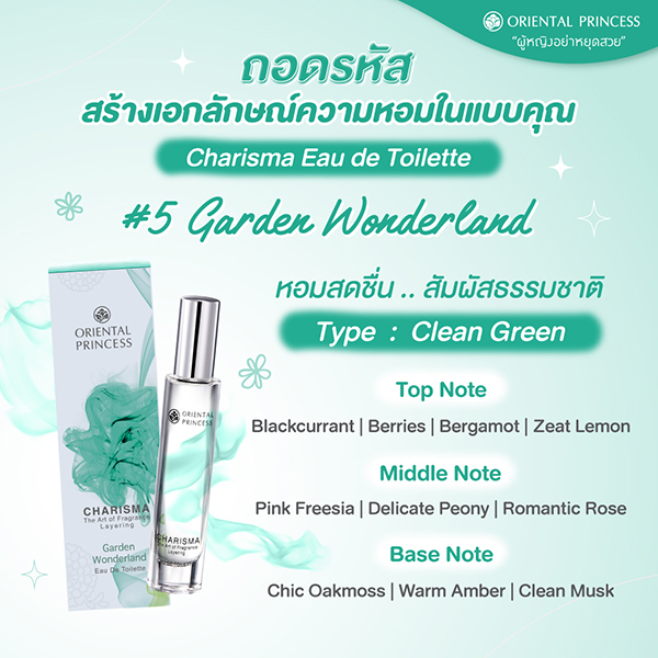 Oriental Princess  จึงจะมาชวนคุณสาวๆ มาหลีกหนีความจำเจ ฉีกกฏการฉีดน้ำหอมแบบเดิมๆ กับการครีเอทมิติแห่งความหอมรูปแบบใหม่ ด้วยเทคนิคการเลเยอร์ริ่ง สู่รหัสลับความหอมเฉพาะตัวในแบบคุณที่ไม่เหมือนใคร กับ Charisma Eau De Toillete  รหัสลับความหอมจากน้ำหอม  5 กลิ่นพร้อมเปิดตัวกลิ่นหอมสดชื่นใหม่กลิ่นที่ 6 เพื่อเสริมทัพรังสรรค์ความหอมในแบบของคุณกันค่ะ