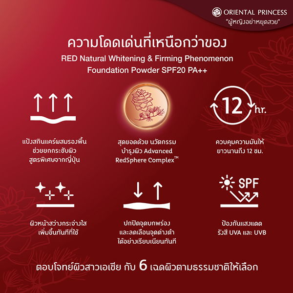 แป้งอัพผิวสว่าง คุมมันยาวนาน 12 ชม. ผสานคุณค่านวัตกรรมบำรุงจากญี่ปุ่น 6 เฉดสีสวยเด่นไม่ดรอป RED Natural Whitening & Firming Phenomenon Foundation Powder SPF20 PA++